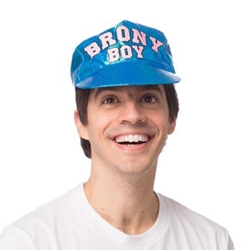 The Brony Boy Baseball Cap is a glittery blue baseball cap with “Brony Boy” displayed in pink.